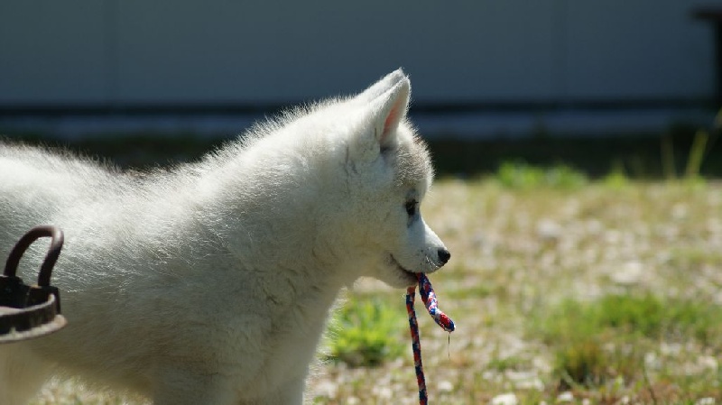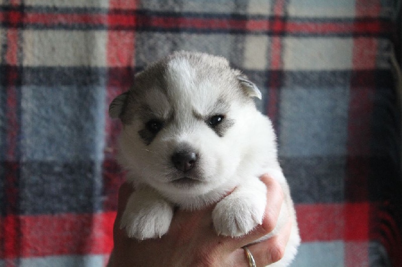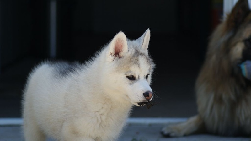 Femelle grise et blanche aux yeux bleus. Tâche blanche à l'encolure. Laïka est une affectueuse chipie. Elle va rejoindre Janouk (Hanook x Altaïr) chez Sylvie et Laurence !